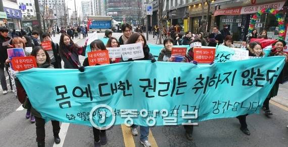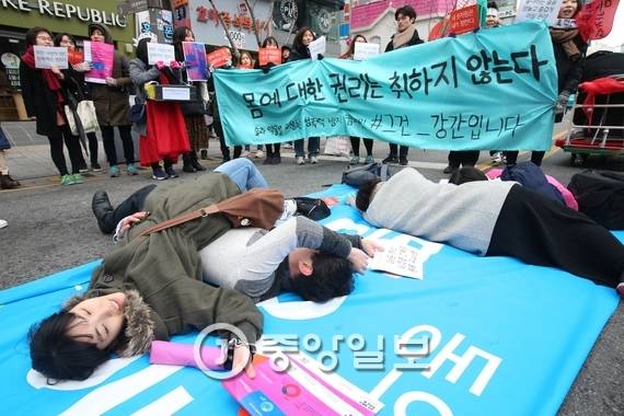 한국성폭력상담소가 14일 오후 서울 신촌 연세로에서 ‘동의하고 하는 행진’ 캠페인을 개최했다. 술이나 약물에 취해 있건, 옷 차림이 야하건 그 어떤 상황에서든 동의하지 않는 성행위는 피해자의 책임이 아닌 그 자체로 ‘성폭력’이라는 것을 알리기 위한 취지다.