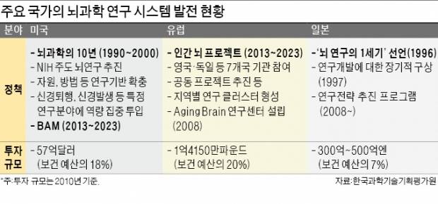 뇌 연구에는 천문학적인 비용이 들어가기 때문에 주로 선진국을 중심으로 국가 차원에서 연구가 이뤄졌다. 미국은 1990~2000년을 ‘뇌과학의 10년’으로 선언하고 세계 뇌 연구를 선도해 왔다. 특히 오바마 정부는 뇌 활동지도(BAM)를 완성하는 연구에 2023년까지 매년 3억달러를 투자하는 야심찬 계획을 발표했다.