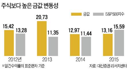세계적으로 경기가 부진했던 2013년에는 최저 1179.40달러에서 최고 1697.80까지 43.95% 폭을 오갔다. 대신증권 분석에 따르면 2012년 이후 지난해를 제외한 3년간 금의 연간 가격 변동성은 S&P500지수 변동성을 뛰어넘은 것으로 파악됐다. 2013년에는 안전자산이라는 금 가격 변동성(하루 수익률의 표준편차, 20.73)이 글로벌 최우량 주식들을 모아놓은 S&P500(11.35)이나 선진국 증시(독일 닥스지수 변동성 14.7)는 물론 신흥국 증시인 중국 상하이종합지수(19.16)보다도 컸다. 요즘 금값이 많이 뛰었다고는 하지만 2011년 9월 온스당 1900.2달러까지 치솟은 점을 고려하면 여전히 35% 넘게 떨어진 상태다. 워런 버핏 벅셔해서웨이 회장이 틈 날 때마다 “금은 정크본드(투기등급 채권)만큼이나 가격 움직임이 변덕스럽다”고 꼬집는 이유다.