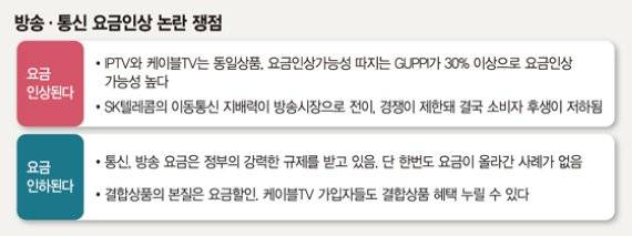 반면 SK텔레콤은 통신요금과 방송요금은 정부의 심사를 받기 때문에 요금이 오를 가능성은 없다고 맞서고 있다. 오히려 결합상품이 다양화되는 만큼 소비자 선택권이 넓어지고 결합할인에 따른 이용자 후생이 증가할 것이라고 설명한다.