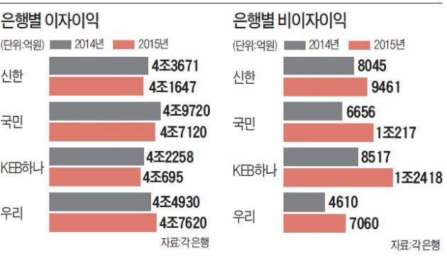 은행들이 본업이 아닌 다른 사업에 눈을 돌리는 건 은행 수익의 80%가량을 차지하는 이자이익이 저금리 때문에 줄고 있어서다. 지난해 신한·국민·KEB하나·우리 등 4대 은행 중 우리은행을 제외한 세 개 은행의 이자이익이 감소했다. 국민은행은 1년 새 이자이익이 2500억원가량 줄었으며 신한은행 2000여억원, KEB하나은행은 1500여억원 감소했다.