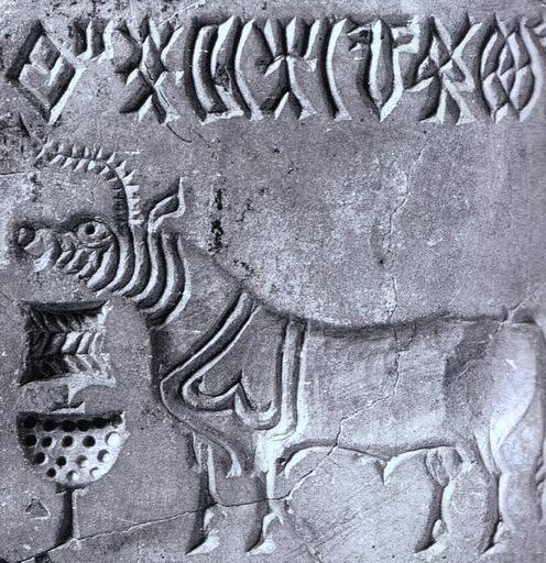 | 인도의 4000년 전 석재 인장. 산스크리트의 원형(原型)일 수도 있는 부호가 그림과 함께 새겨져 있다. |