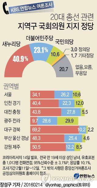 (서울=연합뉴스) 장성구 기자 = 연합뉴스와 KBS가 지난 11~12일 코리아리서치에 의뢰해 전국 성인 남녀 1천13명을 상대로 한 여론조사(표본오차 95%±3.1%P) 결과에 따르면 4.13 국회의원 총선지역구 선거에서 정당 지지도는 새누리당이 40.9%로 가장 높았다.