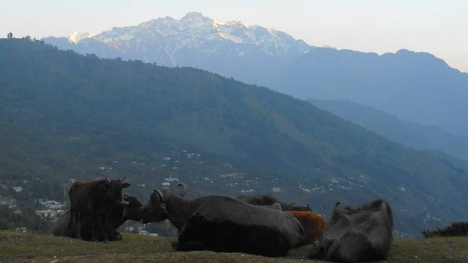 물소들은 여전히 아무런 생각 없이 무엇인가를 오물오물 되새김질을 하고 있고 나는 무엇인가를 먹고 그 기운을 한울에 되돌려 놓아가며 살아가고 있는가 라는 생각을 되새김질 하고 있었다. 그 관념적인 생각들을 비워낼 무렵 아침 해가 히말라야 설산 머리 위로 훤히 떠올랐다.