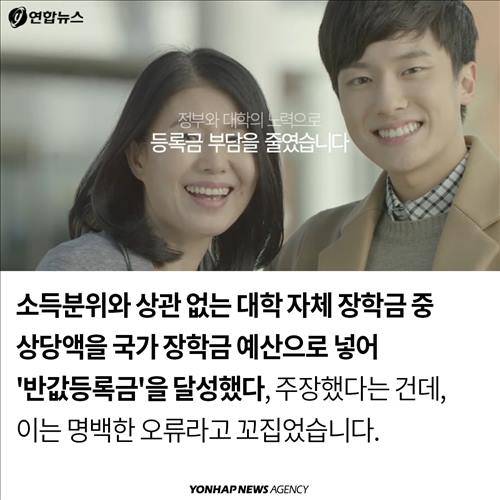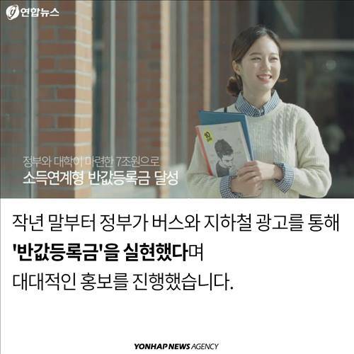 (서울=연합뉴스) 장동우 기자ㆍ전진영 인턴기자 = 작년 말부터 정부가 버스와 지하철 광고를 통해 '반값등록금'을 실현했다며 대대적인 홍보를 했습니다. 그런데 정작 당사자인 학생들의 반응은 시큰둥한데요. '반값등록금' 정말 실현된 걸까요?