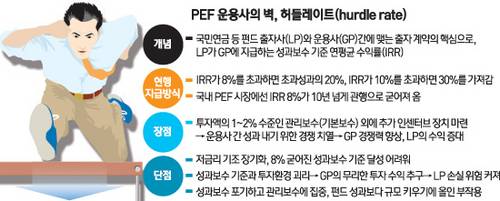 국민연금이 사모펀드(PEF)·벤처투자(VC) 운용사의 성과보수 지급 기준(허들레이트·Hurdle rate)을 현재 8%에서 상당 부분 낮추는 방안을 검토하고 있다. 성과보수는 이들 위탁 운용사가 일정 수익률을 달성할 때 받는 인센티브다. 국내 최대 앵커 투자자(LP)인 국민연금이 10년 이상 유지되고 있는 허들레이트를 낮추면 다른 연기금들도 동참할 가능성이 높아 운용사들의 운용에 숨통이 트일 것으로 기대된다.