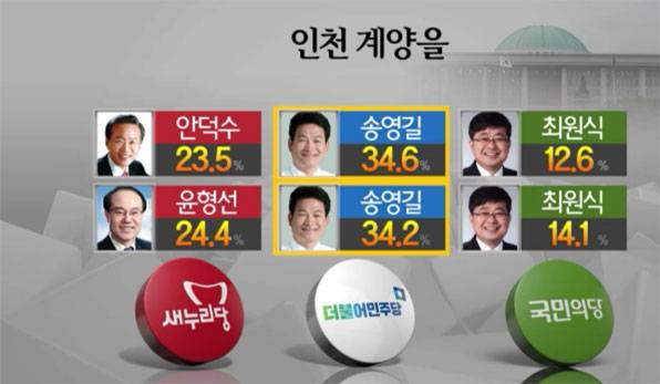 야당 강세 지역으로 3자 구도가 형성된 인천 계양 을은 더불어민주당 송영길 전 인천시장이 다른 당 후보들을 모두 앞섰습니다.