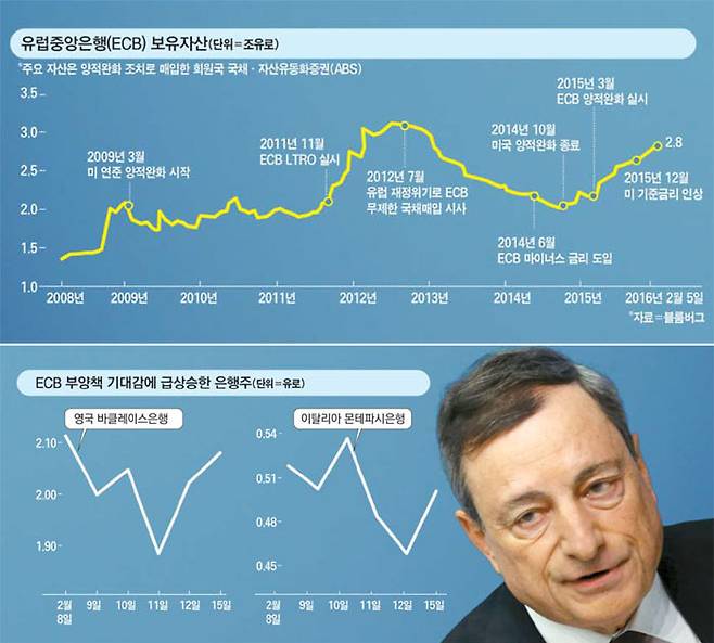 현재 ECB 자산 매입 프로그램 주 대상은 주요국 국채와 자산유동화증권(ABS) 등이다. 유로존 은행 부실채권 매입 외에 드라기 총재는 3월 정례회의 때 양적완화 규모 확대 등 추가적인 통화 완화 정책을 내놓을 예정이다. 래리 엘리엇 가디언 경제담당 에디터는 '유로존 위기가 다시 끓어오른다'는 제목의 칼럼에서 "결국 ECB가 깜짝 놀랄 만한 수준의 부양책을 다음달 내놓지 않으면 위기가 다시 불붙을 수밖에 없다"고 경고했다.