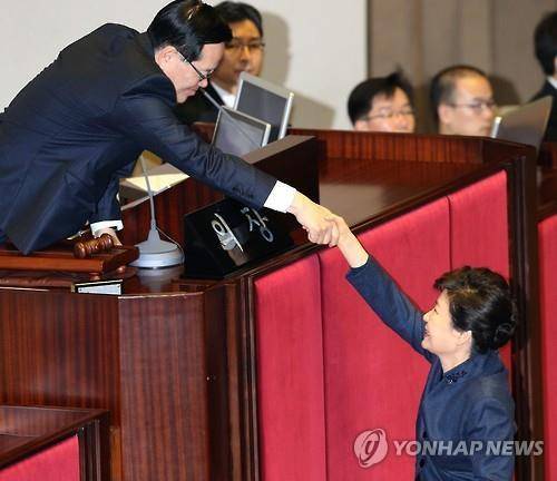 정의화 국회의장은 본관 입구 안쪽에서 박 대통령을 맞았다. 정 의장이 "어서 오십시오"라고 큰 소리로 외치며 악수를 건네자, 박 대통령은 웃음을 띤 채 정 의장의 손을 잡으며 인사했다.