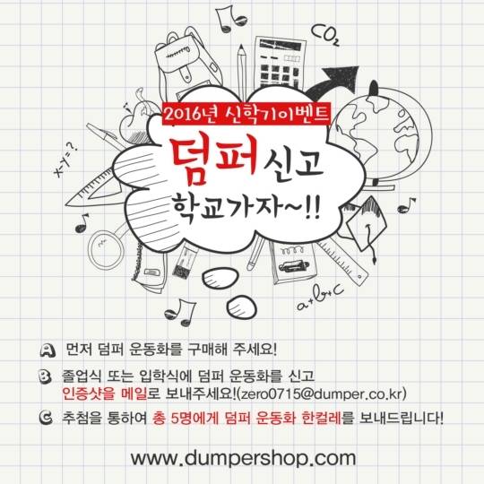 덤퍼가 2016년 신학기 이벤트를 진행합니다. 이번 덤퍼 신고 학교가자 이벤트는 덤퍼 운동화를 신고 인증샷을 찍어 덤퍼 공식 메일로 보내면 된다고 합니다. 이에 추첨을 통해 총 5명에게 덤퍼 운동화를 증정한다고 합니다. 2월에서 4월까지 진행되는 이벤트라고 합니다.
