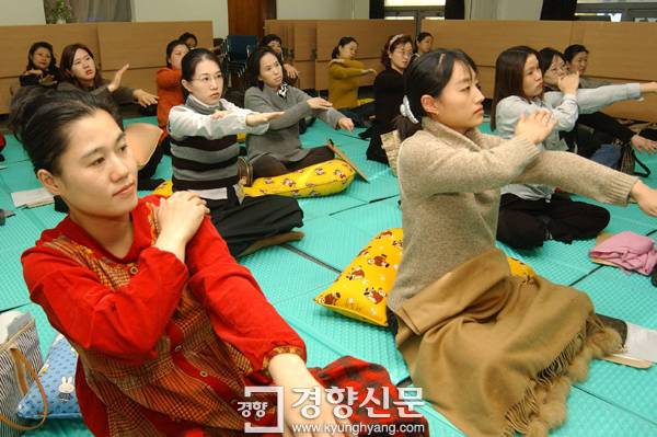 | 임신부가 심한 영양실조에 걸리면 태아는 태어나 성장하면서 임신부가 기아에 노출된 시기에 따라 당뇨병과 같은 질병에 잘 걸린다는 사실이 밝혀졌다. 당뇨병은 엄마의 뱃속에서부터 기회를 엿보는 셈이다. 사진은 서울 한 구청 보건소가 운영하는 출산준비교실에 참가한 임신부들이 강사의 지도에 따라 산전체조를 하고 있는 모습. / 경향신문 자료사진 |