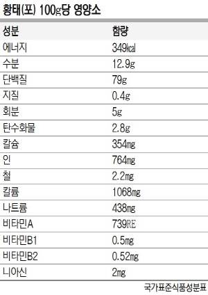 그런 점에서 ‘속풀이 해장’의 대명사로 통하는 황태만큼 좋은 식품도 없다. 겨울에 명태를 일교차가 큰 덕장에 걸어 놓고 얼고 녹기를 반복하며 말린 황태는 단백질 함량에서 일단 여타 식품을 압도한다. 소고기 한우 기준 살코기에 들어있는 단백질 함량과 비교해봐도 곧 알 수 있다. 소고기 살코기 100g에는 19.3g의 단백질이 들어있다. 그런데 황태 100g에는 무려 79g의 단백질이 들어있다. 이는 식품의약품안전처에서 내놓은 성인 단백질 하루 권장섭취량의 143%에 이르는 양이다.