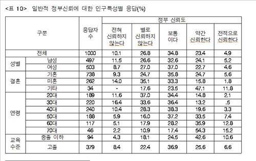 조사결과 정부에 대해 '전혀 신뢰하지 않는다'는 응답이 10.1%였고 '별로 신뢰하지 않는다'는 대답은 26.8%였다.