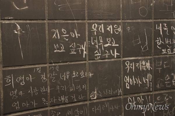 | ▲ 13년 전 대구지하철 참사가 일어났던 중앙로역에 마련된 '기억의 공간'. 검게 그을린 벽체에 유족들이 보고 싶다는 글을 써 놓았다. |