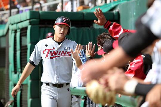 [문선재가 요미우리전에서 득점한 후 선수들과 하이파이브를 나누고 있다. 사진 = LG 트윈스 제공]기사 제보 및 보도자료 press@mydaily.co.kr