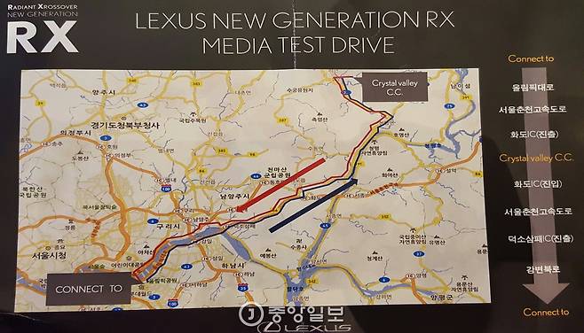 계기판입니다. 하이브리드차인 만큼 왼쪽 엔진 분당 회전수(RPM) 눈금을 CHARGE(충전)·ECO(연비주행)·POWER(고속주행)로 나눴습니다. 웬만큼 달리면 에코, 세게 밟으면 파워, 페달에서 발을 떼거나 브레이크를 밟으면 ‘지이잉’ 소리를 내며 충전 게이지 눈금이 올라가는 식입니다. 왼쪽 아래 ‘EV’(전기차) 표시가 RX 450h가 하이브리드차란 사실을 알려주네요. 시동을 걸어봤습니다. 하이브리드차 답게 ‘부르릉’ 소리같은 건 없습니다.오늘 시승 코스입니다. 서울 잠실동 롯데월드몰을 출발해 올림픽대로-춘천고속도로를 달려 경기도 가평 크리스탈밸리를 찍고 오는 코스입니다. 왕복 120㎞를 달렸습니다. 크기를 한층 키운 헤드 업 디스플레이(HUD)가 한결 주행 정보를 보기 편하게 도왔습니다.