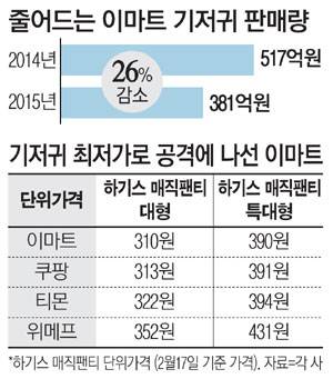 ![이마트가 전 유통채널과의 최저가 경쟁을 선포한 18일 이마트 용산점에서 주부 소비자가 기저귀를 고르고 있다. [사진 제공〓이마트]](https://img4.daumcdn.net/thumb/R658x0.q70/?fname=http://t1.daumcdn.net/news/201602/18/mk/20160218192403566nyeh.jpg)