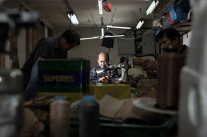 앉아서 작업하던 마의영(54)씨가 자리에서 일어선다. 손끝의 힘을 이용하기 위해서다. 외피 가죽에 내피 지퍼를 붙인다. 송곳으로 지퍼 끝을 여미고 손톱으로 동그랗게 말아 접은 후 망치로 두드려준다. 내피와 외피를 합체하는 최종 박음질이 끝나자 앵클부츠의 몸통이 완성됐다. 구두의 윗부분을 제작하는 ‘갑피(제갑)공정’에서 완성된 구두 반쪽은 신발창과 굽을 만드는 ‘저부공정’으로 보내져 나머지 반쪽과 결합한다. 구두장이의 손끝에서 태어난 멋쟁이 구두가 유명 상표를 달고 세상에 나가 어느 여인의 발을 뽐내며 거리를 누빈다.