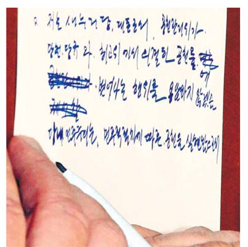| 새누리당 김무성 대표가 18일 국회에서 열린 최고위원회의에서 공천룰 논란과 관련해 자신을 겨냥한 최고위원들의 발언을 들으며 메모지에 ‘공천룰에 벗어나는 행위를 용납하지 않겠다’고 적고 있다. 연합뉴스 |