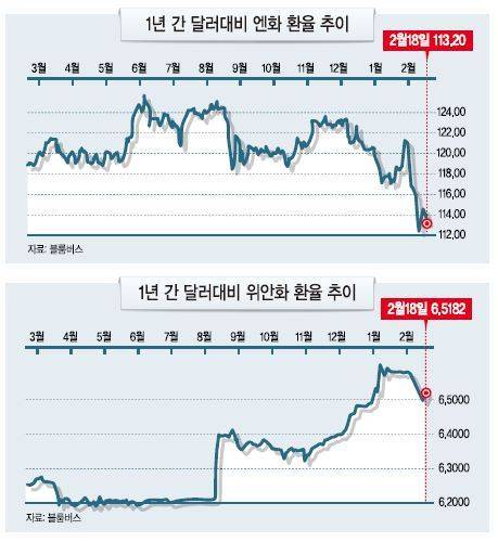 ▶엔화 강세→약세로 전환?= 약세를 보이던 엔화가치도 2월 들어 급등하고 있다. 일본은 정부부채의 95%가 엔화표시채로, 채무상환 불능 가능성이 다른 나라보다 크게 적어 안전자산으로 꼽힌다.이 때문에 일본은행(BOJ)의 마이너스 금리 도입에도, 엔화는 오히려 강세를 보이고 있는 것이다. 실제로 지난달말 달러당 121.39엔까지 떨어졌던 엔화가치는 18일 113엔까지 상승했다. 이대로가다간 연말 100~105엔까지 엔화가치가 오를수 있다는 전망도 나온다.