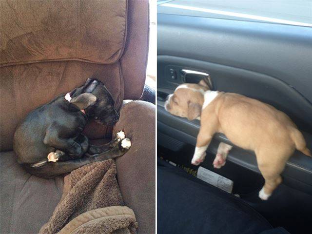 해외 유머 블로그 ‘새드앤유슬리스(Sad and Useless)(http://www.sadanduseless.com/2016/01/dogs-can-sleep-anywhere/)’는 아무데서나 잠을 청하고 있는 강아지들의 사진을 소개했다. 밥그릇이 침대인 마냥 몸의 절반 이상을 넣고 잠을 자는가 하면, 쇼핑 카트에서 두 발을 쭉 뻗고 자는 강아지도 있다. 심지어 주인의 신발에 얼굴을 묻고도 잘 잔다. 특히 사람처럼 배를 보이고 대자로 드러누운 강아지들이 많은데, 매우 편하게 잠을 자고 있다는 의미라고 한다.