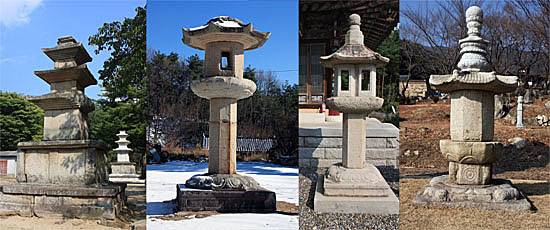 | ▲ 대구시 기념물 3호인 '부인사 터' 말고도 부인사에서 볼 수 있는 문화재들 (사진 왼쪽부터) 유형문화재 17호 서탑(1964년 복원), 석등(유형문화재 16호, 통일신라 시대 작품, 1964년 복원), 일명암지 석등(문화재자료 22호, 고려 전기 작품 추정), 부도(유형문화재 28호, 조선 전기 작품 추정) |