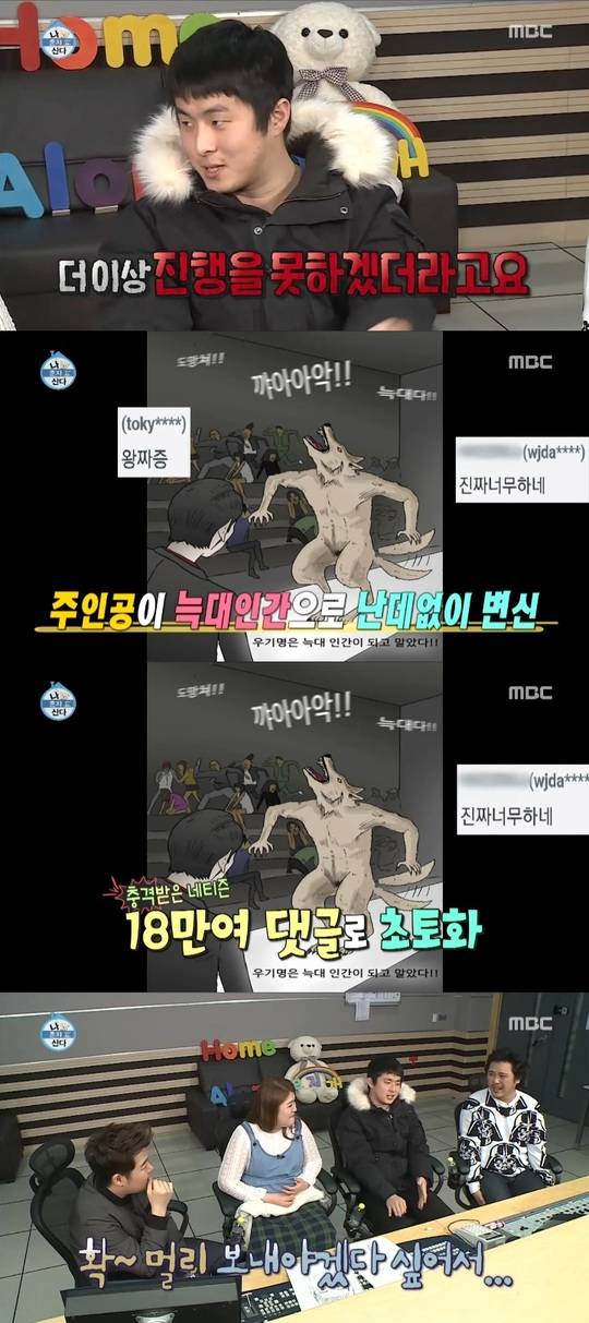 기안84는 이들로부터 악플 18만 개 달린다는 얘기를 들은 후 '패션왕'에서 늑대인간이 된 이유를 밝혔다. 과거 인기 웹툰 '패션왕' 연재 당시 패션쇼장에서 주인공이 늑대인간으로 난데없이 변신해 18만여 개의 악플을 받은 바 있다.