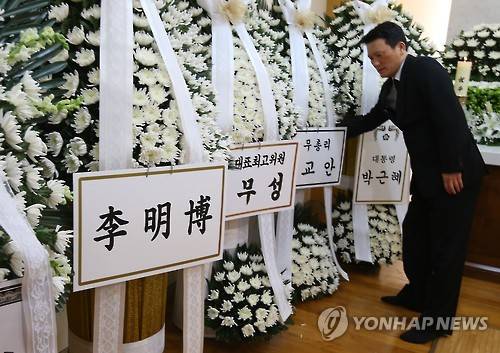 (서울=연합뉴스) 김도훈 기자 = 20일 오후 서울 서초구 서울성모병원에 마련된 이기택 전 민주당 총재 빈소에 박근혜 대통령, 이명박 전 대통령을 비롯한 인사들이 보낸 화환들이 놓여 있다. 고인은 경북 포항 출신으로 부산 상업고등학교와 고려대 상과대학을 졸업한 뒤 1967년 제7대 국회 때 신민당 전국구 의원으로 정치권에 진출해 7선 의원을 지냈다. 발인은 24일이며 장지는 4.19 국립묘지에 마련된다. 2016.2.20