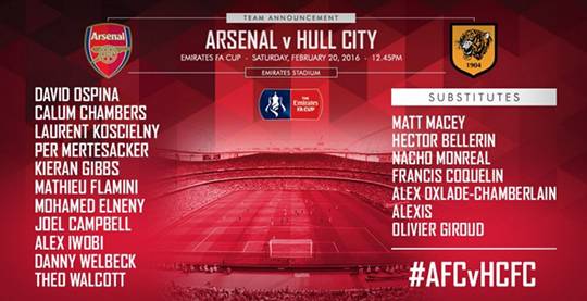 아스널은 20일 오후 9시 45분(한국시간) 영국 런던에 위치한 에미레이트 스타디움서 2015/2016시즌 잉글리시 FA컵 16강 헐 시티와의 경기를 앞두고 있다.