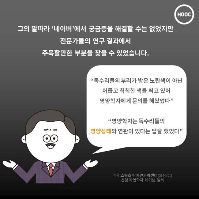 이런 과정을 찾다보니 “독수리 부리가 왜 노랄까?”라는 궁금증이 더욱 커졌습니다. 강형우는 자신의 페이스북에 이유는 네이버에도 나와있지 않다고 남겼는데요.