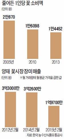 꽃 소비가 줄면서 선물용으로 많이 나가는 장미, 거베라, 안개꽃 등 매출은 5년 새 절반 가까이 떨어졌다. 2012년 2월 3억4000만원이던 거베라 매출은 작년 2월 1억7700만원으로 줄었다. 양재 화훼시장에서 소매 꽃가게를 운영하는 한진희 씨는 “기업 인사철에도 승진이 줄어 꽃이 안 나간다”며 “국회마저 김영란법 등에서 꽃 선물을 규제하고 있어 걱정이 크다”고 푸념했다.
