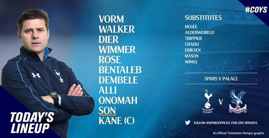 # 토트넘 선발 라인업 포름(GK) - 로스, 빔머, 다이어, 워커 - 벤탈렙, 뎀벨레 - 오노마, 알리, 손흥민 - 케인 / 감독 : 마우리시오 포체티노