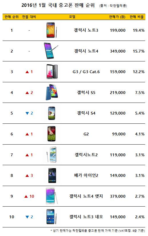 갤럭시노트3(19.4%), 갤럭시노트4(15.7%), G3(12.2%) 순중고폰 판매업체 착한텔레콤 발표우체국 알뜰폰, 선택약정할인으로 중고폰 증가