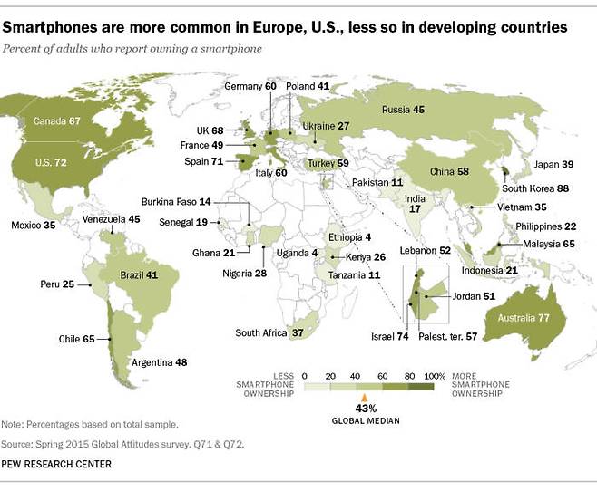 스마트폰 보유율은 선진국이 평균 68%, 개도국이 37%였다. 개도국은 2013년 21%, 2014년 28%에 비해 크게 늘었지만 여전히 선진국에 비해서는 낮은 수준이라고 퓨리서치는 밝혔다.