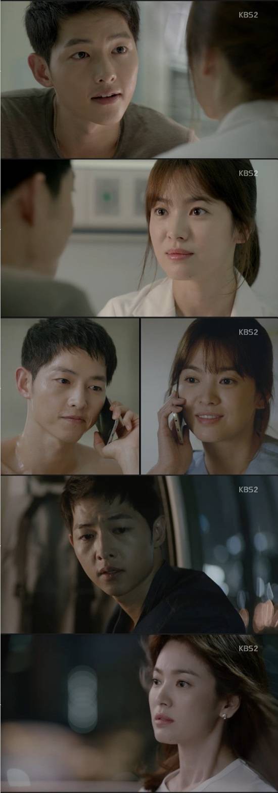 유시진과 강모연은 밤에 전화통화를 하다가 서로 보고 싶은 마음에 당장 해성병원에서 만나기로 했다. 하지만 아프가니스탄에서 UN 직원 2명이 피랍됐다는 뉴스속보가 나오면서 유시진과 강모연은 생이별을 하게 됐다. 유시진이 급하게 부대의 연락을 받고 헬기를 타고 복귀해야 했던 것.
