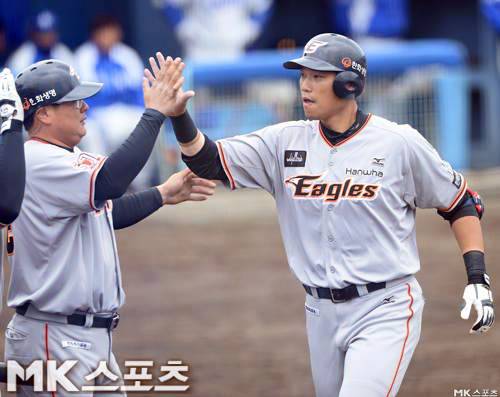 김태균 '최진행, 투런 홈런 멋졌어' [MK포토]