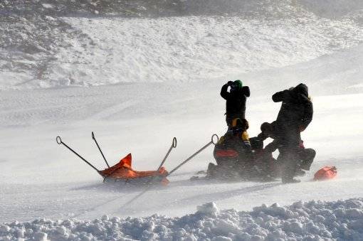 | 패트롤이 토보간으로 막상스 무자통 선수를 이송중인 모습. 정선 알파인경기장의 슈퍼대회전 경기 도중 상황이다. |