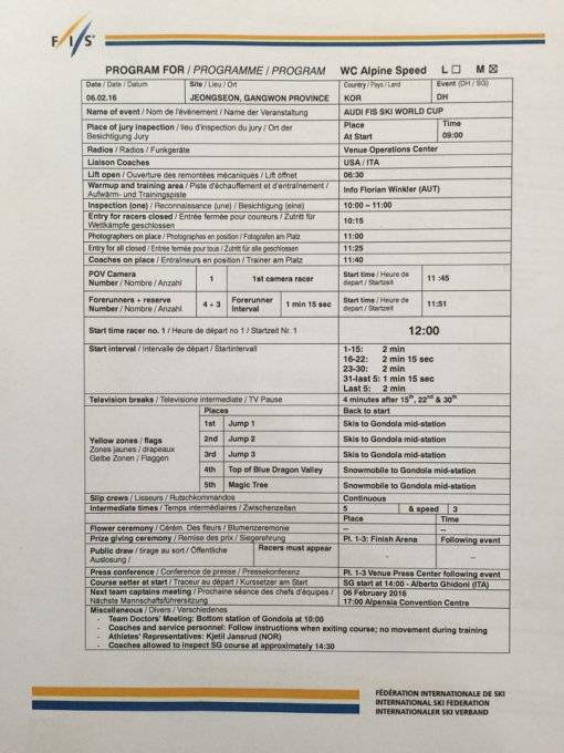 | FIS 월드컵 알파인스키 활강경기의 공식 진행표. |
