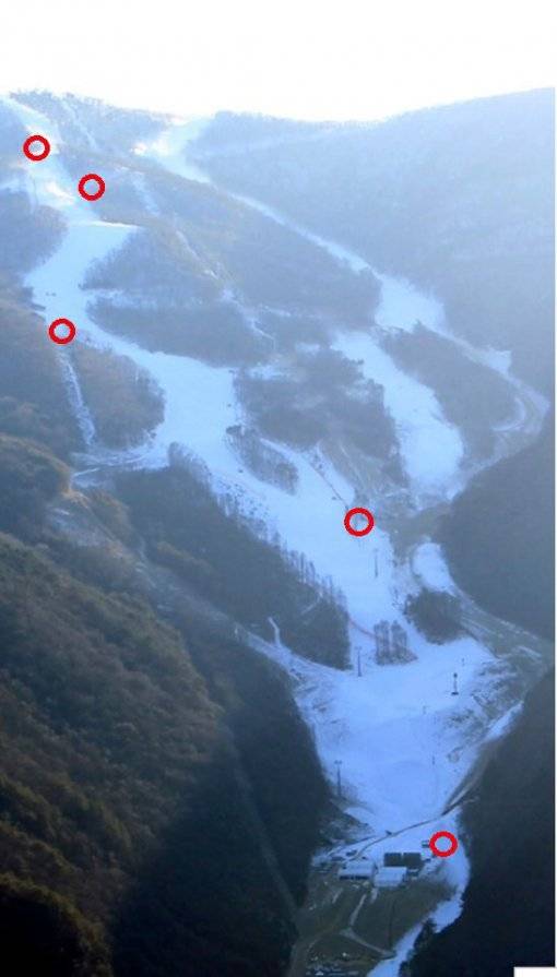 | 정선 알파인경기장 모습. 저 빨간 표식은 의무지원팀 의사가 배치될 다섯 개 섹션을 보여준다. |
