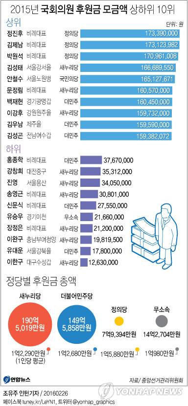 국민의당 천정배 공동대표와 정의당 심상정 대표는 각각 9천680만원(228위), 1억3천935만원(170위)의 후원금을 모았다.