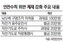 앞으로 구명조끼를 입지 않고 낚싯배를 타다 적발되면 최고 100만원의 과태료를 내야 한다. 술 먹고 자전거를 운행하다 적발돼도 20만원의 벌금을 내야 한다.