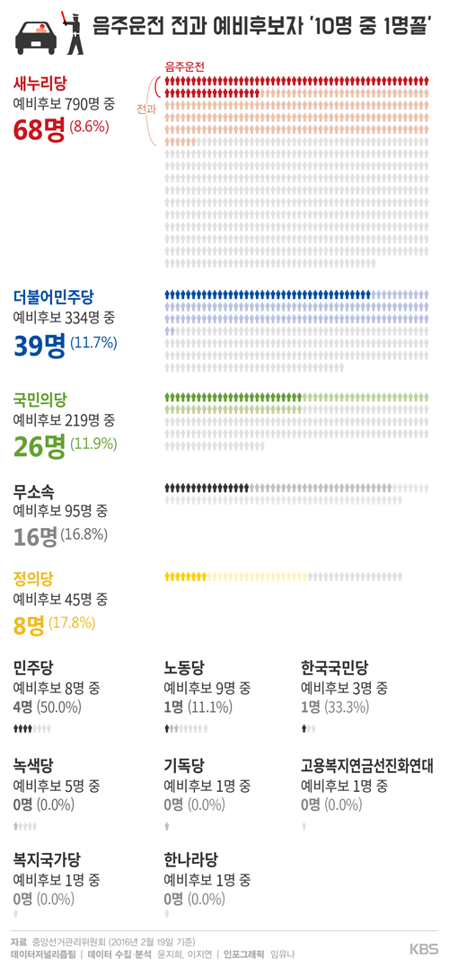 KBS 데이터저널리즘팀이 이번 20대 국회의원 선거 출마를 위해 등록한 예비 후보자들의 전과 기록을 전수조사한 결과, 10명 중 1명꼴로 음주운전 전과가 있는 것으로 드러났습니다. 전체 예비후보자 천 512명(2월 19일 기준) 가운데 술에 취한 상태로 운전을 하다 적발된 후보자는 163명. 10.8%가 음주운전으로 처벌받은 겁니다.
