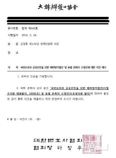 대한변호사협회(대한변협) 하창우 회장은 지난달 25일 '20대 총선을 앞두고'라는 성명서에서 이렇게 선언했다. 그리고 1달 뒤인 지난 24일, '국민보호와 공공안전을 위한 테러방지법안 및 동법 본회의 수정안(테러방지법)에 대한 검토' 의견서를 국회가 아닌 김정훈 새누리당 정책위원회 의장에게 제출했다.
