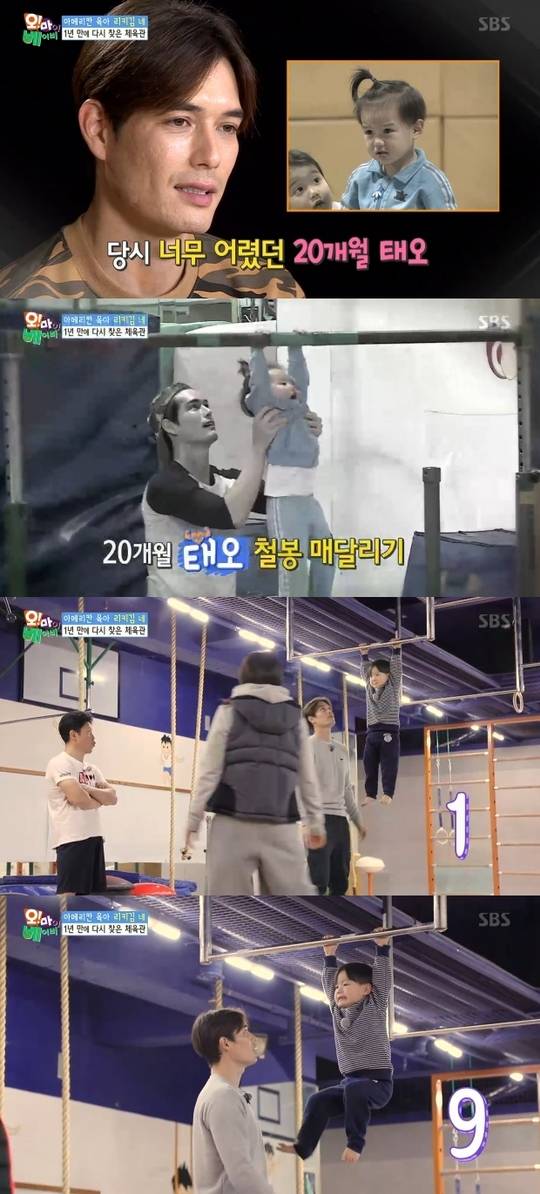 지난해 20개월 태오는 철봉 매달리기를 3초 동안 했다. 태오는 리키김에게 보호 받으며 다시 철봉에 매달렸다.