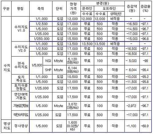 국토지리정보원 관계자는 "지도는 공공재적 성격이 있어 수수료와 가격을 인하하게 됐다"며 "국민 누구나 부담없이 수치·영상지도를 활용할 수 있게 됨에 따라 공간정보 산업이 활성화할 것"이라고 말했다.
