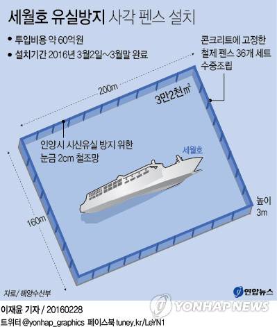28일 해양수산부에 따르면 세월호 인양추진과는 중국 상하이샐비지와 함께 유실방지 방안을 검토해 세월호 주변으로 가로 200m, 세로 160m, 높이 3m의 철제펜스를 설치하기로 했다.