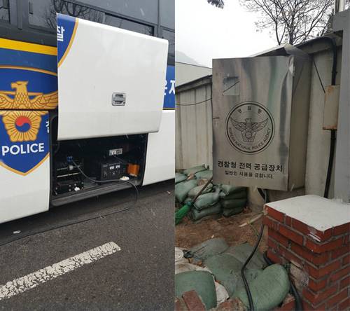 | 청운동주민센터 옆에 있는 배전시설을 이용해서 경찰 버스가 전기를 공급받고 있다. 남혜정 기자 |