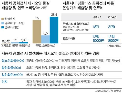 인하대 의학전문대학원 임종한 교수는 “정차하면서 공회전할 경우 주행 때보다 미세먼지와 이산화질소(NO₂)가 30∼40% 더 발생한다”며 “특히 경유차는 미세먼지가 3배 이상 더 나온다”고 밝혔다. 연세대 환경공해연구소 임영욱 부소장도 “공회전 중에 냉난방을 하면 엔진에 과부하가 걸리는데 과부하 상태에서는 오염 물질이 더 많이 배출된다”고 지적했다. 서울환경운동연합 관계자는 “서울시는 이번에 경찰버스의 온실가스 배출량만 측정했을 뿐 정확히 어떤 오염물질이 얼마나 배출되는지 알 수 없다”며 “상시적인 경찰버스 공회전을 막아야 한다”고 지적했다.