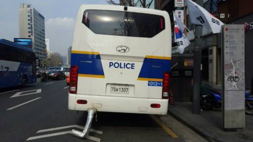 | 4차 민중총궐기 대회가 열린 27일 오후 서울 중구 서울광장 인근에서 경찰버스들이 공회전을 하고 있는 모습. 매연이 차도 쪽으로 나가게 배출구에 짧거나 긴 연통을 설치했다. 박진영 기자 |