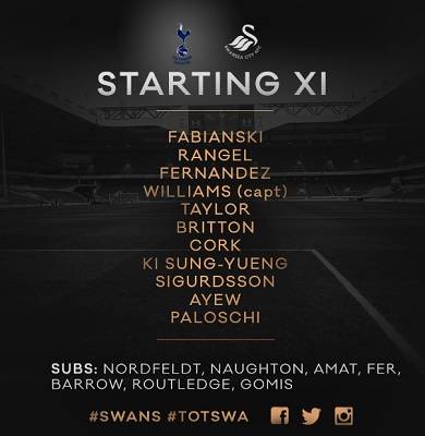 #스완지 선발 라인업 파비안스키(GK) - 테일러, 윌리엄스, 페르난데스, 랑헬 - 브리튼, 코크, 기성용 - 시구르드손, 팔로스키, 아예우 / 감독 : 프란체스코 귀돌린